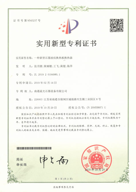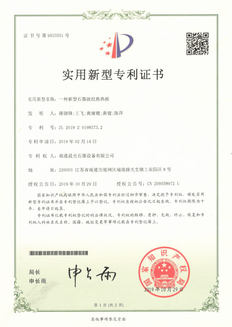 實用新型專利 :一種新型石墨波紋換熱板 專利號:ZL 2019 2 0198373.2