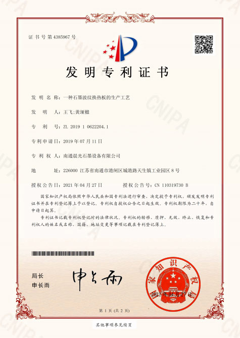 發明專利:一種石墨波紋換熱板的生產工藝 專利號:ZL 2019 1 0622204.1